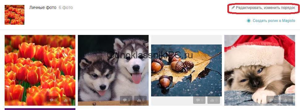 Все снимки окажутся в ОК в одном альбоме – «Личные». Зайдите в созданный фотоальбом и щелкните на ссылку «Редактировать, изменить порядок».