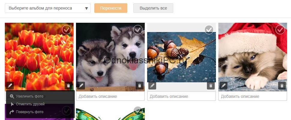 Теперь можно совершить следующие действия со снимками: переместить в другой альбом, добавить описание, отметить друзей, повернуть кадр или удалить его.