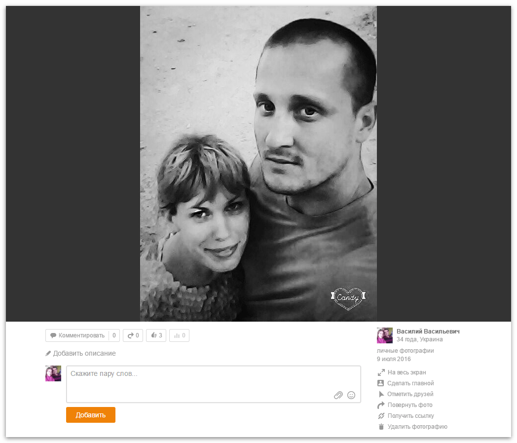 Для добавления своего комментария к кадру кликните на поле «Добавить описание» и впишите информацию – дату и место съемки, интересные подробности произошедшего. Наведите курсор мышки на значок в виде карандаша в нижнем левом углу фотоснимка – появится небольшое меню. Щелкните на «Увеличить фото» – оно откроется в отдельном окошке в крупном размере. Здесь доступны дополнительные функции: кадр можно сделать главным в профиле или получить ссылку на него.