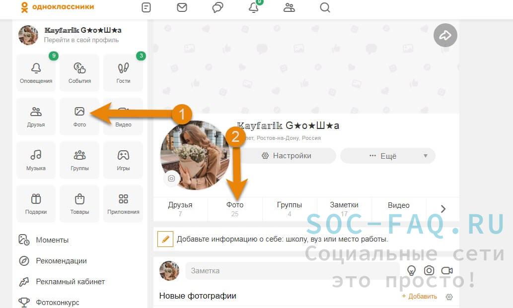 - Перейти в раздел «Фото». Ссылка на него расположена слева, под аватаркой.