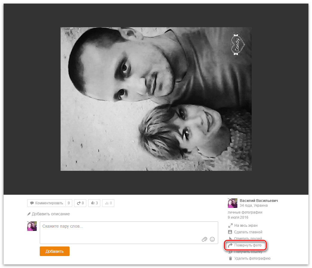 Если кадр загрузился в неправильном положении – горизонтальный стал вертикальным или наоборот – его можно быстро повернуть прямо в ОК. Кликните в меню снимка «Повернуть фото» и он перевернется по кругу на 90 0 . Если этого недостаточно – жмите еще раз и фотография продолжит вращение.