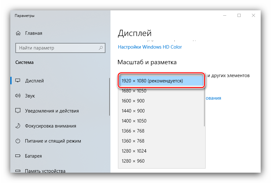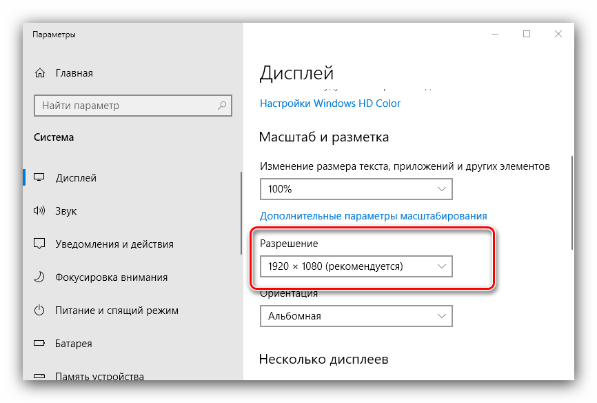 Чаще всего такая проблема возникает вследствие неправильно выбранного разрешения – например, 1366×768 при «родных» 1920×1080. Проверить это и установить корректные показатели можно через «Параметры экрана».