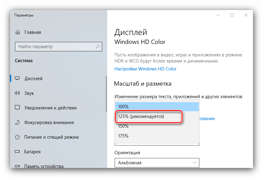 1.Проделайте шаги 1-2 из предыдущего способа, но на этот раз найдите список «Изменение размера текста, приложений и других элементов». Как и в случае с разрешением, желательно выбирать параметр с припиской «(рекомендуется)».