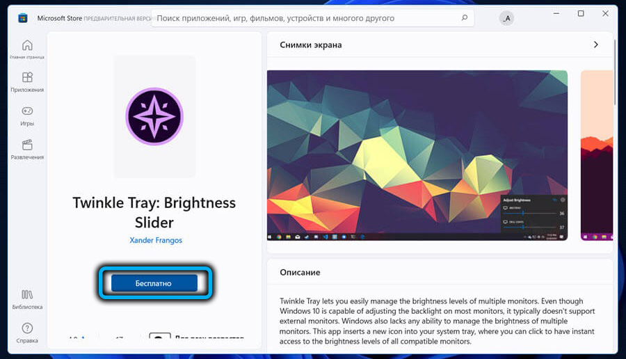 Загрузить приложение можно из Microsoft Store, установка достаточно простая. В результате вы получите ползунок яркости в системном трее, рядом с ползунком изменения громкости. Утилита предоставляет возможность работать с несколькими мониторами, умеет изменять параметр в зависимости от внешней освещённости, после установки иконка приложения появится и на панели задач, и в меню «Пуск».