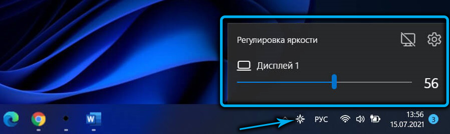 Чтобы отрегулировать яркость дисплея в ноутбуке, можно воспользоваться иконкой управления электропитанием. Расположена она в системном трее в нижнем правом углу экрана. Метод одинаков для любой версии Виндовс.