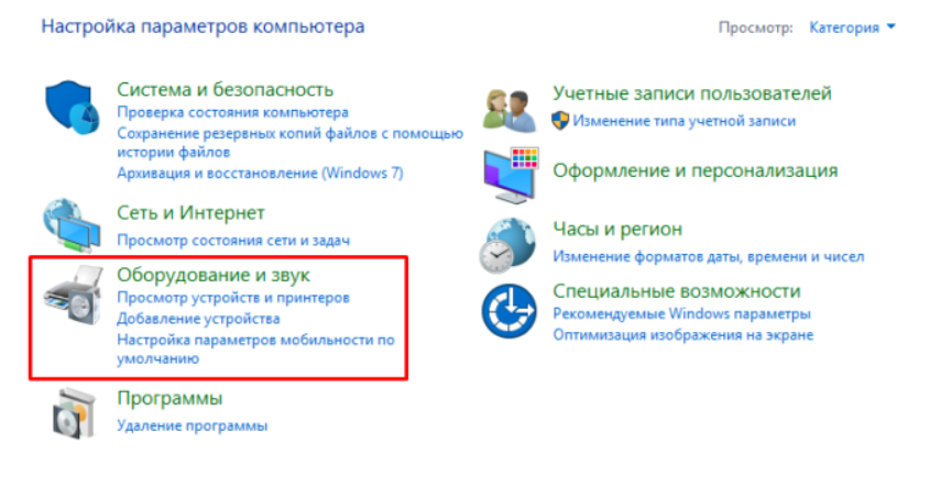 Далее вам необходимо зайти в пункт «Оборудование и звук». Пусть вас не смущает название, так как именно этот пункт отвечает за настройки питания и яркости.