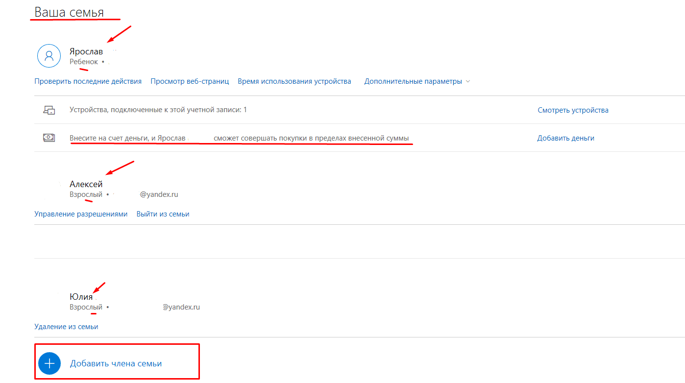 Родители могут добавлять к своим учетным записям детей и других членов семьи.