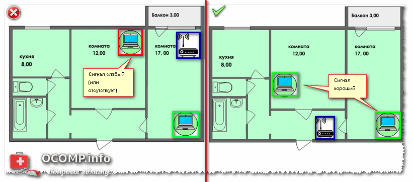 Дело в том, что в зависимости от того, где у вас будет размещен Wi-Fi роутер — будет сильно зависеть уровень приема сети в разных уголках вашего дома. Снижают существенно сигнал Wi-Fi: несущие толстые стены, зеркала, металлические двери и пр.