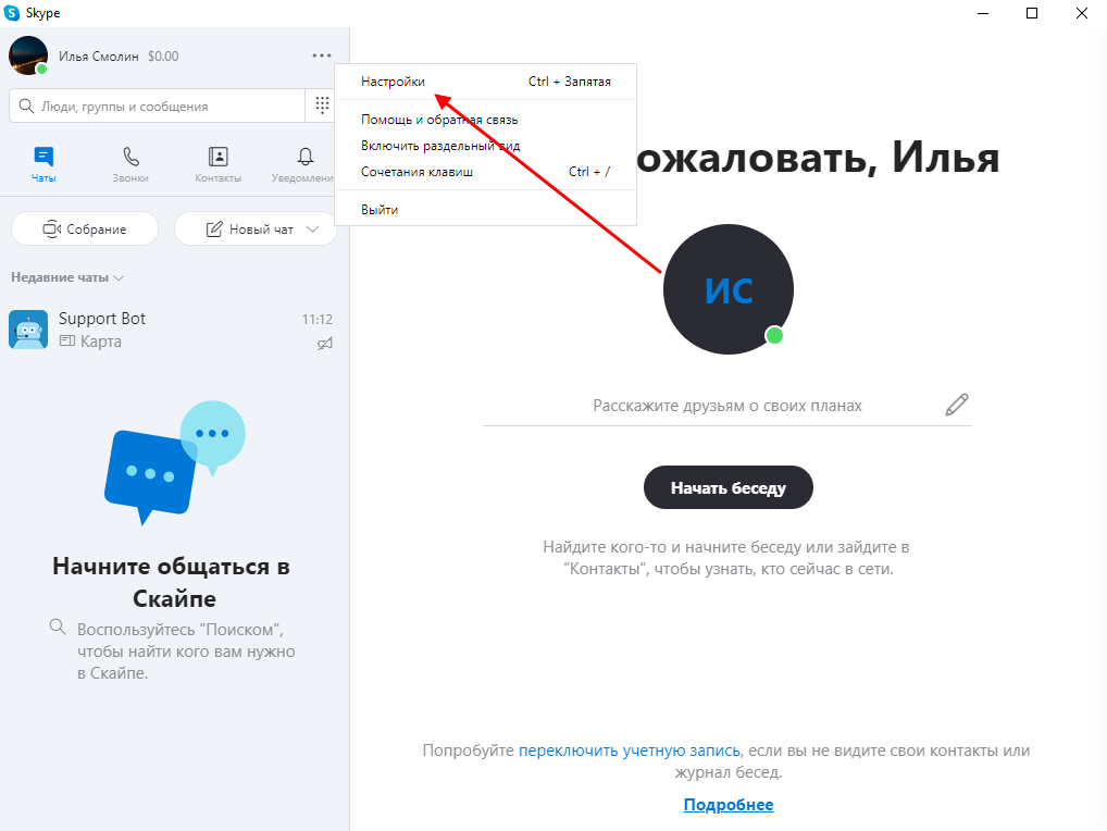 - Запускаем на компьютере скайп и переходим в раздел «Настройки».