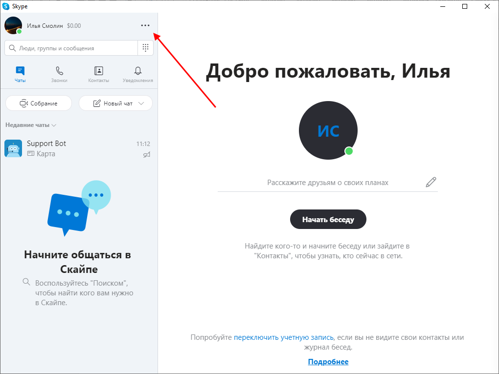 - Открываем на компьютере скайп и нажимаем на кнопку в виде троеточия, расположенную справа от аватара профиля.