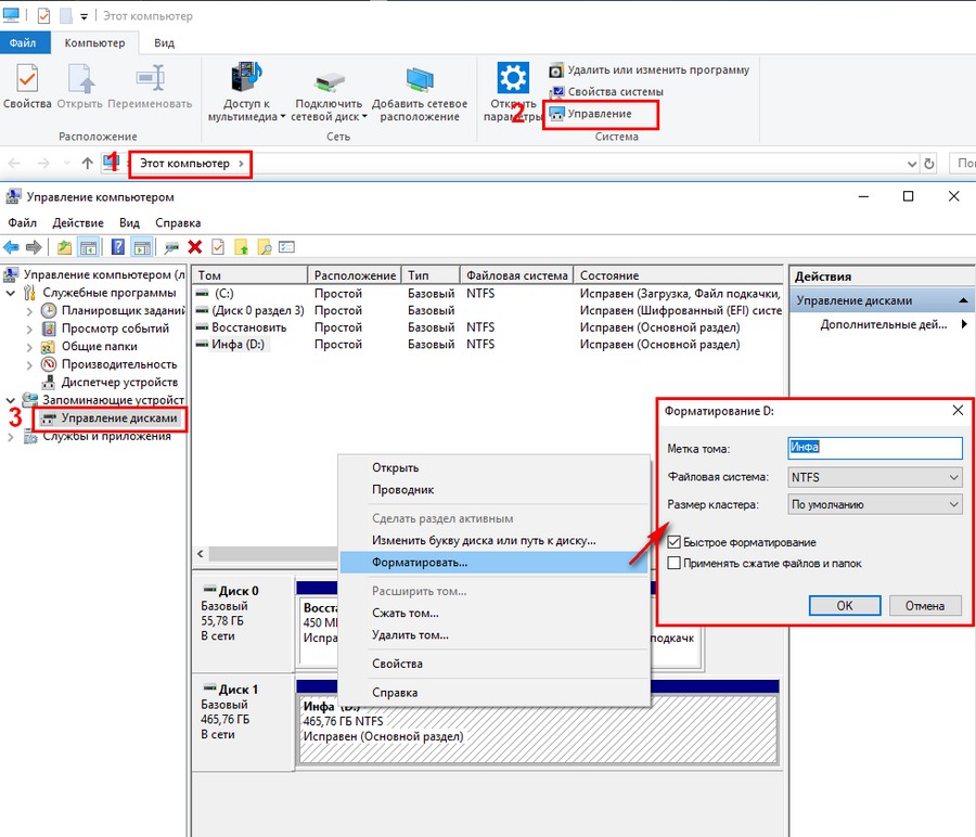 Здесь находятся все винчестеры, подсоединенные к вашему ПК. Кликаем правой кнопкой мыши по нашему диску и выбираем «Форматировать». Получаем окно с параметрами, где требуется задать необходимые настройки, а также выбрать вариант быстрого или полного форматирования.