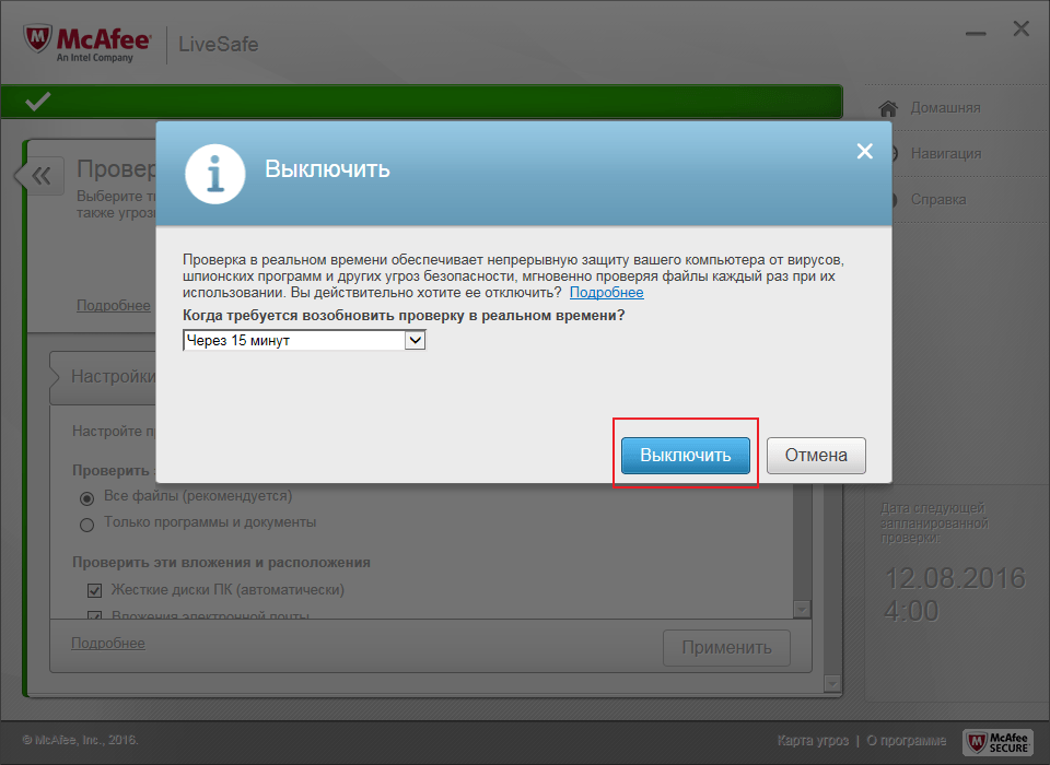 - Теперь в пункте «Проверка в реальном времени» выключите приложение. В новом окне можно даже выбрать через сколько минут антивирус выключится.