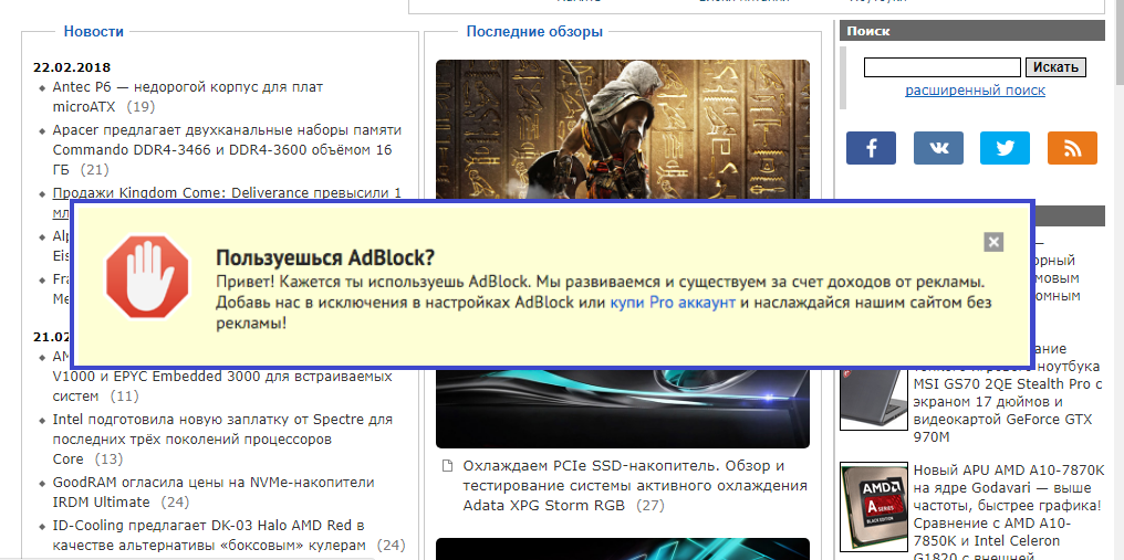 Рис. 4. Пример сообщения с просьбой отключения блокировщика рекламы.