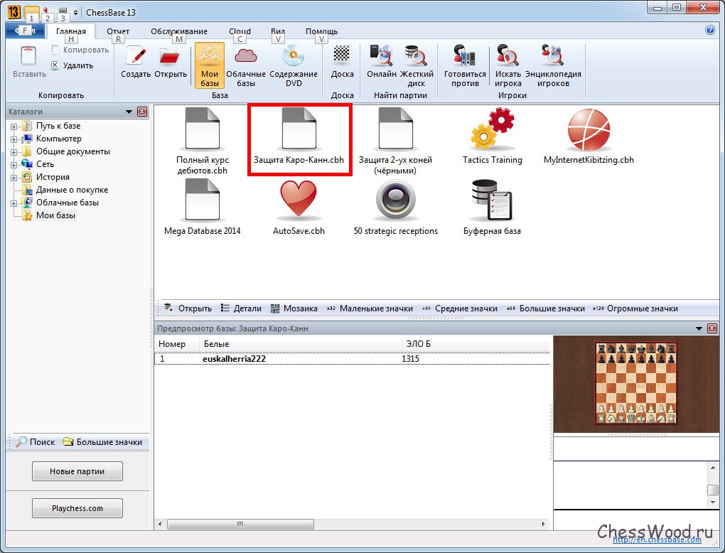 Теперь можно приступать к созданию базы данных и сохранению в ней открытой партии. Имеет смысл хранить базы данных не на системном диске «С», а на диске, предназначенном для хранения данных, например диске «D». На диске «D» можно создать общую папку для хранения баз данных, а внутри её, отдельные папки для каждого дебюта ( , и т.д.).