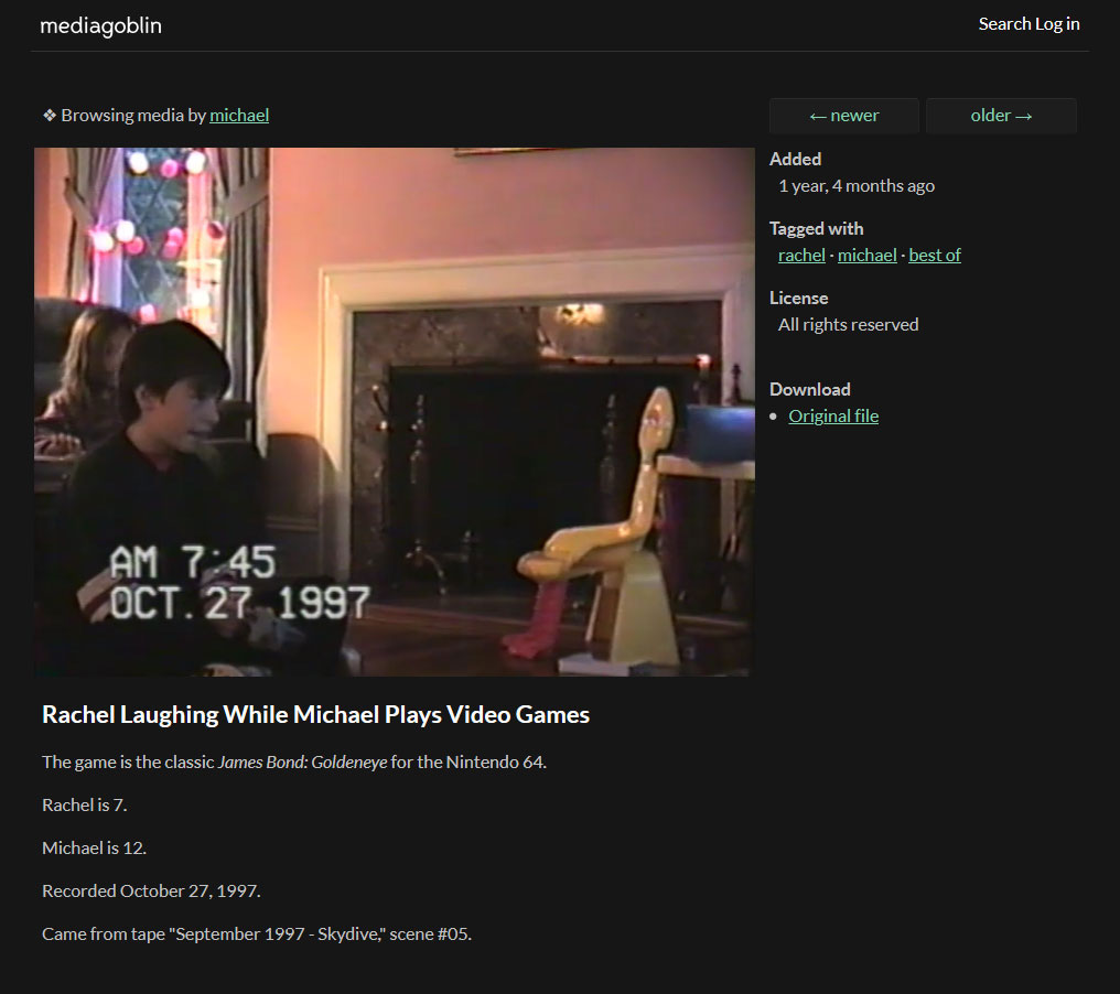 Получилось 513 отдельных видеоклипа. У каждого название, описание, дата записи, теги для всех участников с указанием возраста на момент записи. Всё лежит на приватном медиасервере, доступ к которому есть только у членов семьи, а хостинг стоит меньше 1 доллара в месяц.