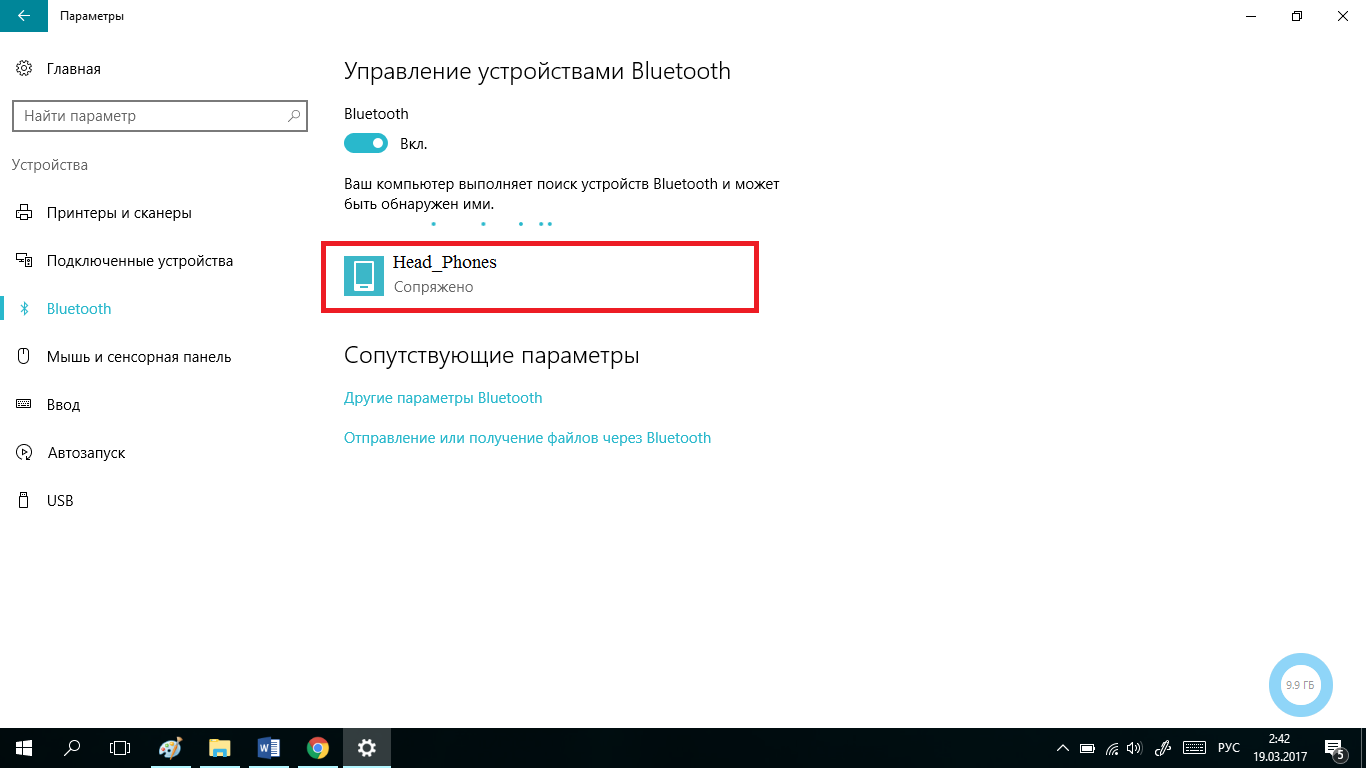 Проще всего активировать передатчик на Windows 10, потому что, какой бы адаптер пользователь не приобрёл, в 99% случаев после его подключения ОС сама найдёт, загрузит и установит все нужные драйвера. По итогу нужно подождать примерно 10 минут, после чего в трее появится синий значок Bluetooth, свидетельствующий о том, что передатчик активирован и находится в ожидании Блютуз устройств.