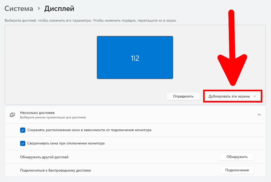 Под макетом расположения мониторов в выпадающем списке выберите «Дублировать эти экраны».