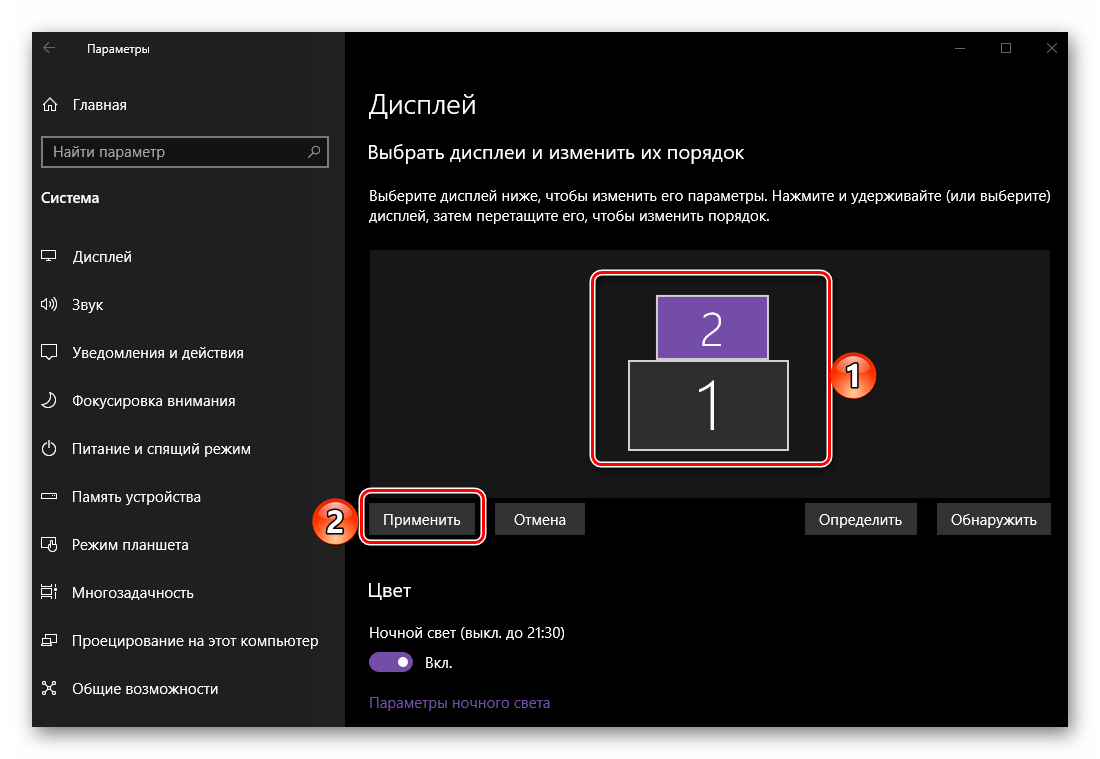 После пятого шага в углу обоих экранов появятся цифры, обозначающие то, какой дисплей является ведущим. При необходимости вы можете поменять главный, кликнув по соответствующей иконке в «Параметрах», или вовсе отключить его.