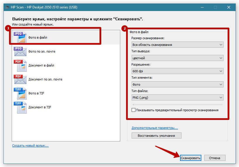 Выберите необходимый вариант сканирования. Выставьте подходящие параметры для документа и кликните мышкой на «Сканировать».