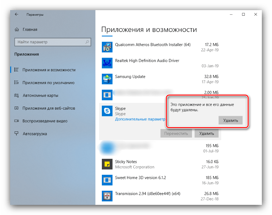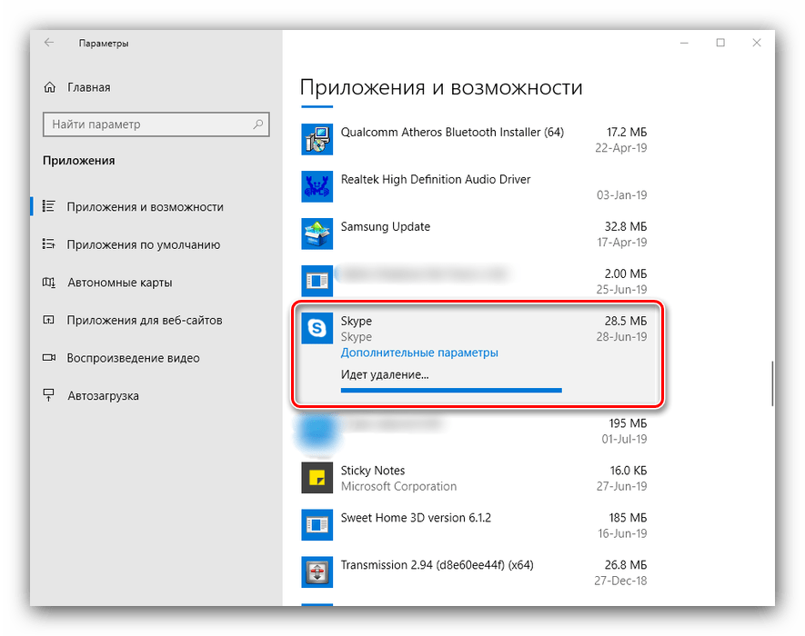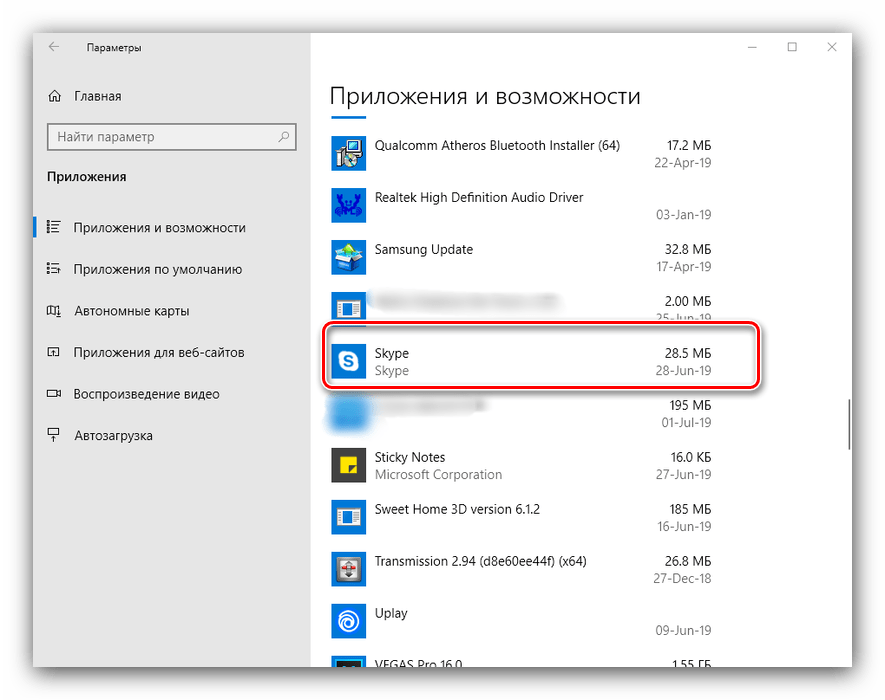 - Отыщите в списке установленных приложений графу под названием Skype.