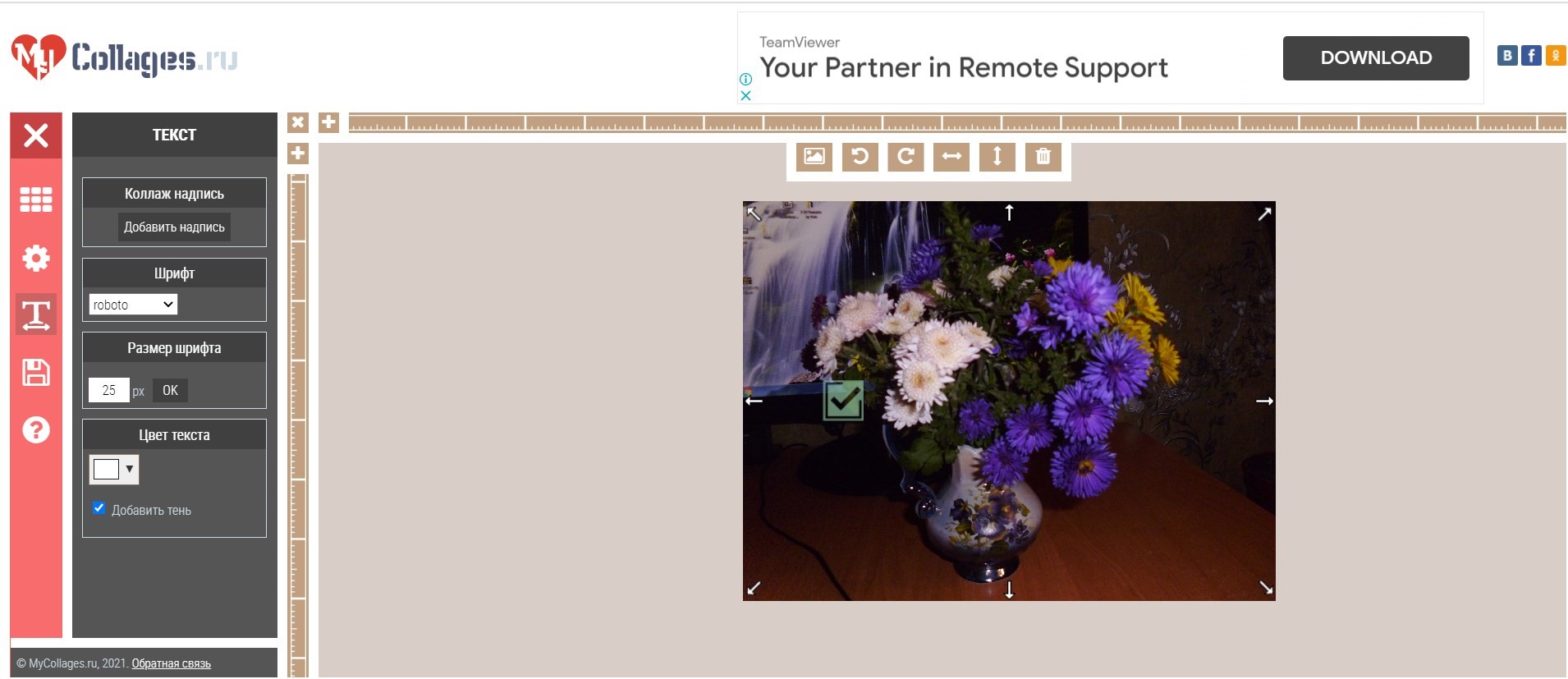 - Открыв в браузере сайт Mycollages.ru, нажимаем «Создать коллаж». Появляется окошко со стандартным шаблоном. Панель слева отвечает за параметры, редактирование, скачивание и сохранение готовой картинки. Справа прикручены кнопки социальных сетей – чтобы опубликовать работу на своей страничке, достаточно одного клика.