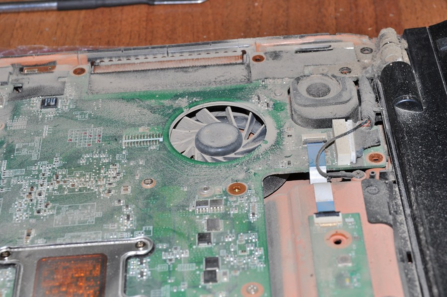 Эту проблему можно устранить очень просто. Достаточно разобрать компьютер (схему разбора для своей модели ноутбука, смотрите в интернете) и извлечь из него всю плату охлаждения, вместе с вентилятором. Теперь аккуратно прочистите все лопасти кулера и вентиляционную решётку (отверстие, через которое выходит горячий воздух при охлаждении). Все готово, собираем девайс обратно и наслаждаемся его тихой и продуктивной работой. Следует отметить, что если очень долго не обращать внимания на засорённость охладительного вентилятора, это может привести к люфту в крепёжной системе винта, а такое повреждение можно исправить лишь заменой повреждённых деталей или всей охладительной системы, как бывает в большинстве случаев.