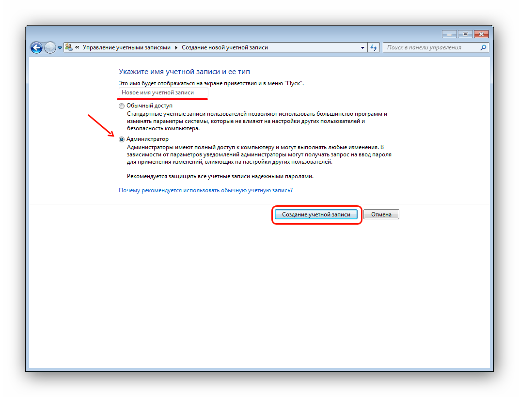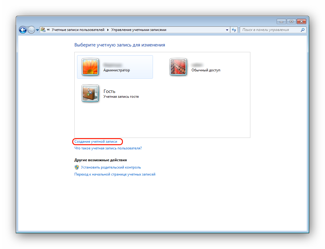 Для этого перейдите в «Панель управления» — «Управление учетными записями» — «Добавление и удаление учетных записей» — «Создание новой учетной записи» (результат отображен на рисунке внизу).