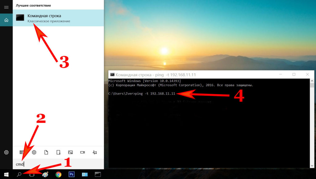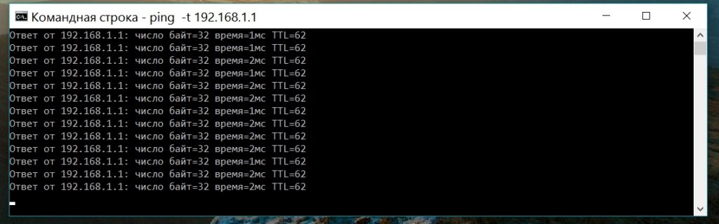 - Появиться командная строка, пишем в ней IP адрес второго компьютера. К примеру: ping –t 192.168.10.11.