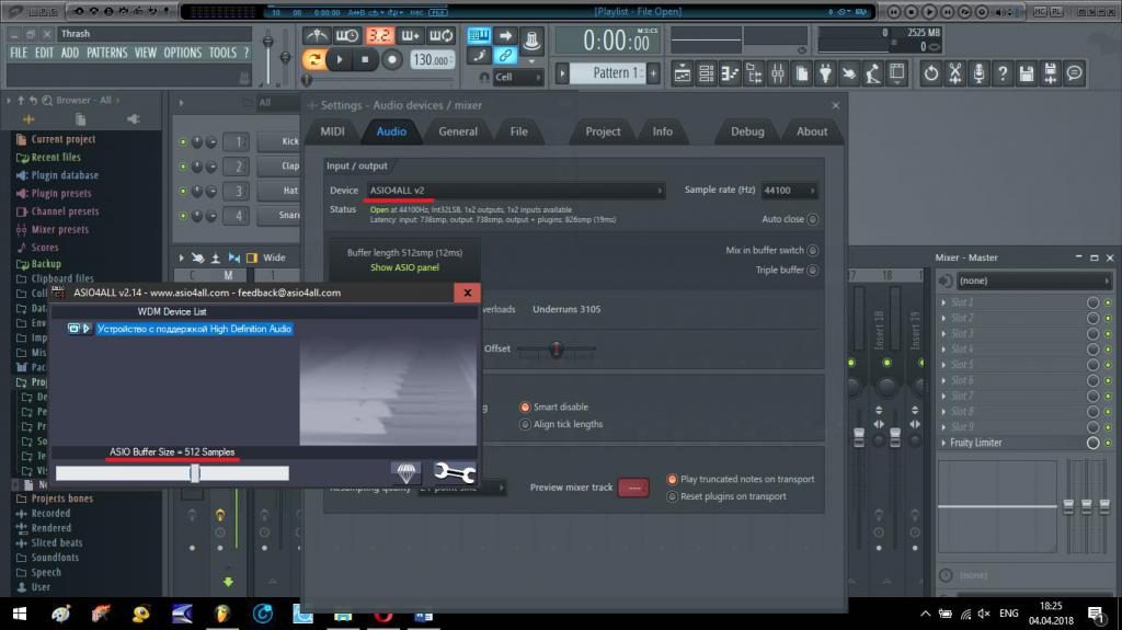Первостепенное внимание уделите настройкам аудио и используемым драйверам (желательно установить ASIO4ALL или FL Studio ASIO)