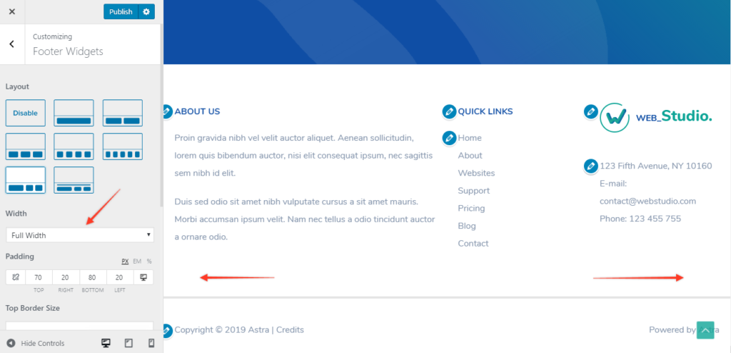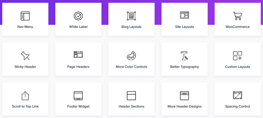 Astra Pro предлагает 18 отключаемых модулей. Большинство модулей улучшает и увеличивает функционал бесплатной версии в Кастомайзере Вордпресс.