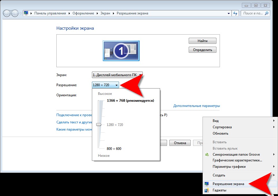 5) Если изображение вы все-таки увидели, но оно с искажениями, то идем опять же в контекстное меню рабочего стола – Разрешение экрана. Здесь нужно выставить стандартное разрешение вашего монитора, указанное в инструкции.