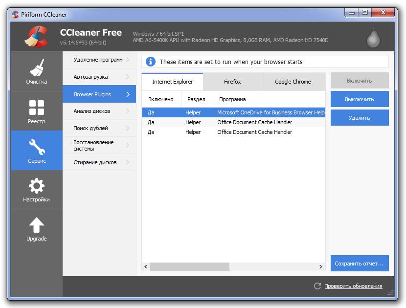 Еще одним важным моментом в восстановлении работоспособности Internet Explorer является отключение различных вредоносных плагинов в Интернет браузере. Поэтому прежде чем прибегать к переустановке Интернет браузера, вы можете воспользоваться отключением ненужных надстроек браузера. Чтобы не копаться в настройках Интернет Эксплорера, можно воспользоваться утилитой CCleaner, с помощью которой вы быстро можете отключить или удалить плагины.