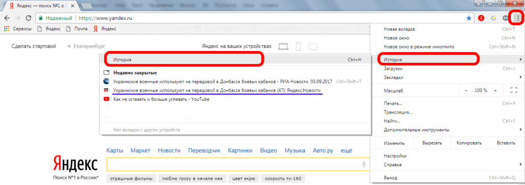 Чтобы подчистить хвосты нам нужно перейти в историю просмотров на компьютере в Яндекс Браузере. Для этого кликаем по «Меню» в правом верхнем углу программы и переходим в раздел «История» (или используйте сочетание клавиш CTRL + H).