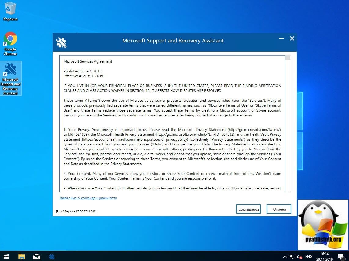На рабочем столе у вас появится ярлык «Microsoft Support and Recovery Assistant» и откроется окно лицензионного соглашения, нажмите «Соглашаюсь«.