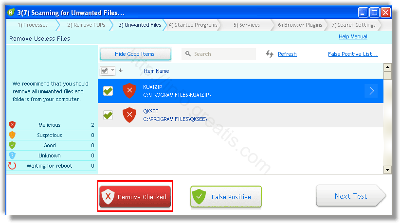 - Обнаруживаем что-то на очередном этапе. UnHackMe отличается тем, что показывает вообще все, и очень плохое, и подозрительное, и даже хорошее. Не будьте обезьяной с гранатой! Не уверены в объектах из разряда “подозрительный” или “нейтральный” — не трогайте их. А вот в опасное лучше поверить. Итак, нашли опасный элемент, он будет подсвечен красным. Что делаем, как думаете? Правильно — убить! Ну или в английской версии — Remove Checked. В общем, жмем красную кнопку.