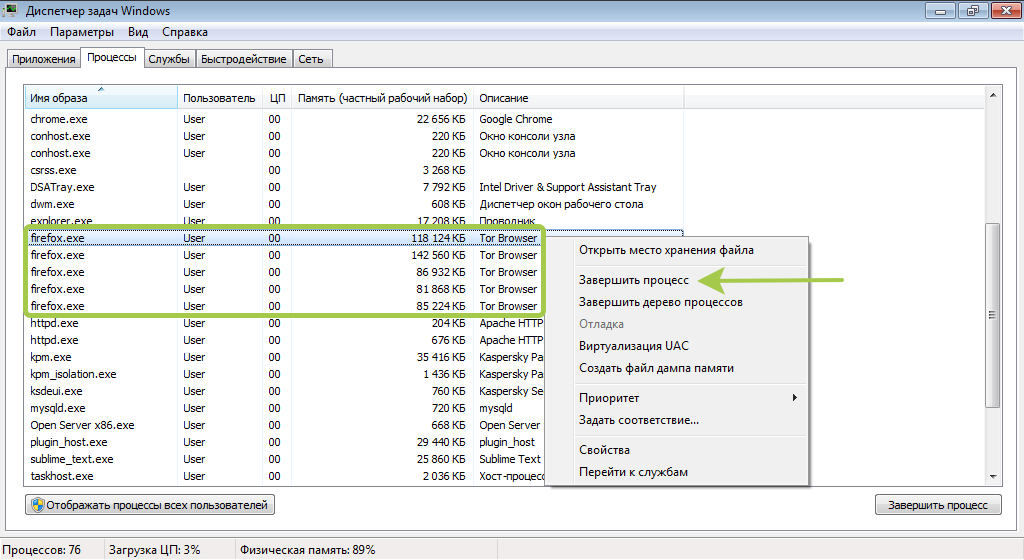 Шаг 1. Перед тем, как удалить браузер Тор — убедитесь в том, что связанные процессы с ним остановлены. Для этого нажмите Ctrl + Alt + Del , запустите диспетчер задач и снимите соответствующую галочку напротив приложения.