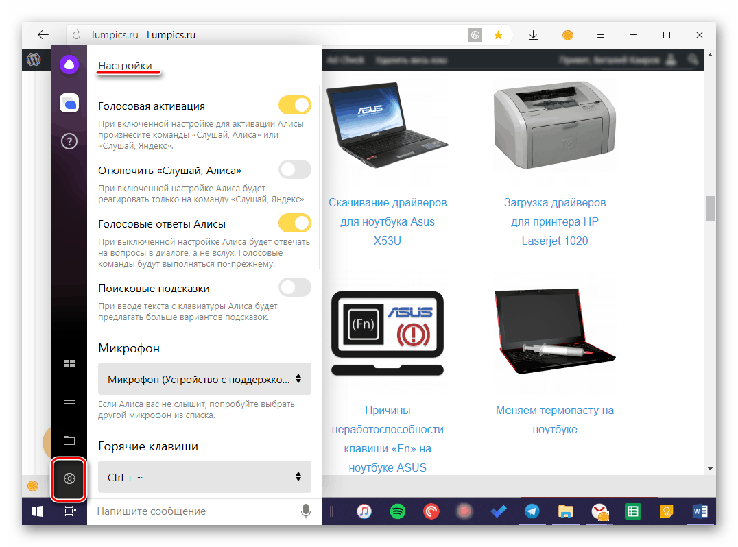 Во вкладке «Настройки» можно включить или отключить голосовую активацию Алисы, ее ответы и используемую для вызова команду. Здесь же можно настроить микрофон, задать комбинации клавиш для быстрого вызова меню помощника.