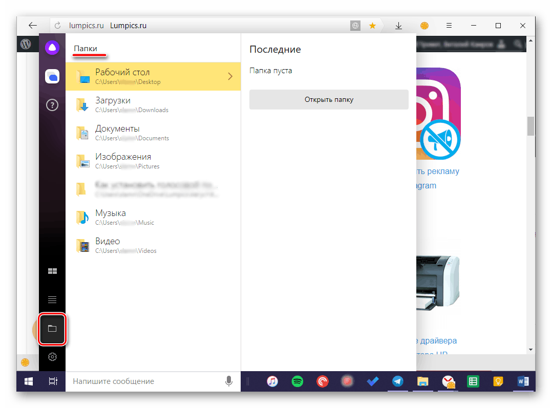 Расположенная ниже вкладка «Папки» — это практически полноценная альтернатива стандартному «Проводнику». Отсюда можно получить быстрый доступ к пользовательским каталогам на системном диске и последним открытым директориям. По наведению на них указателя курсора доступны дополнительные действие, такие как открытие папки и/или содержащихся в ней файлов.