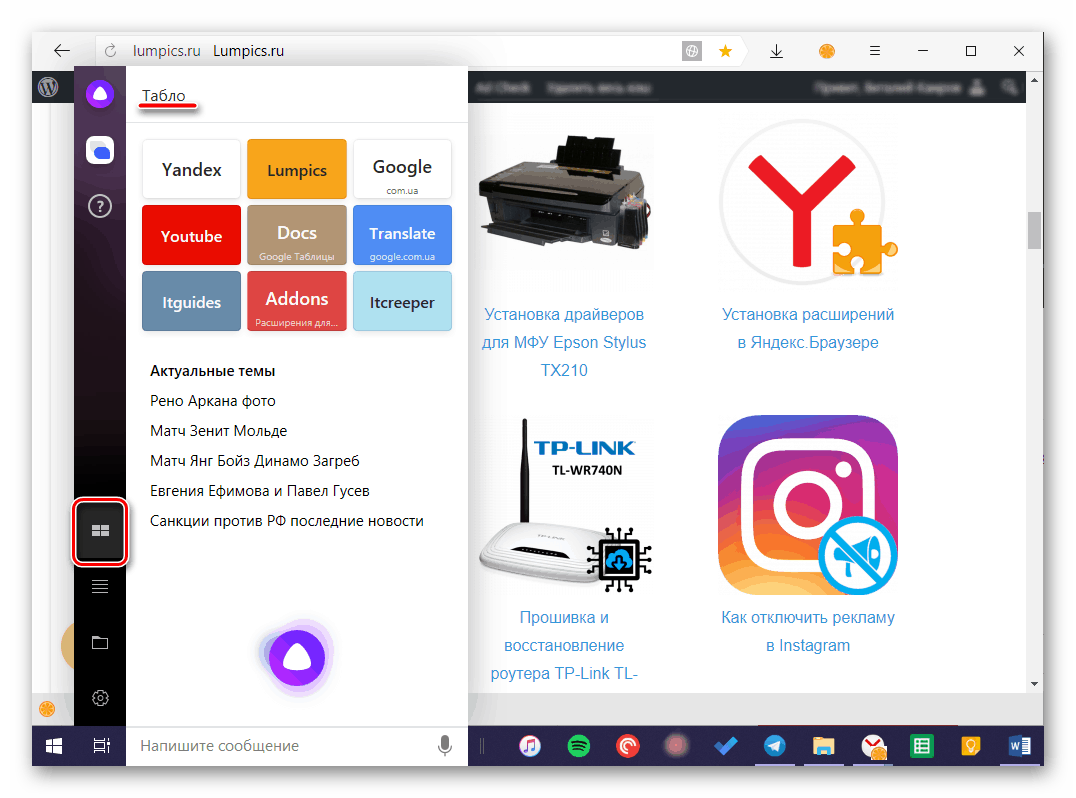 Непосредственно через интерфейс Алисы для ПК можно просматривать «Табло» браузера (панель закладок) и открывать представленные в нем и последние посещенные веб-ресурсы, а также видеть актуальные темы (заголовки) и поисковые запросы.