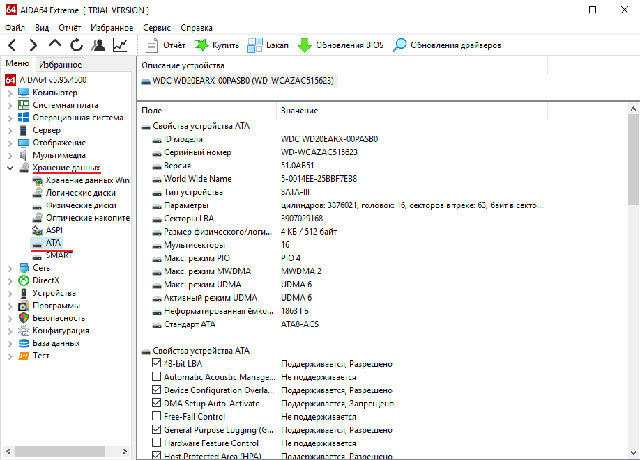 Программа AIDA64 дает возможность узнать много интересной информации об установленных дисках — поддерживаемые свойства, команды и прочие технические детали.