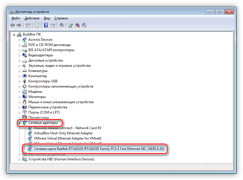 - Открываем «Диспетчер устройств» (см. выше) и находим свой сетевой адаптер (карту).