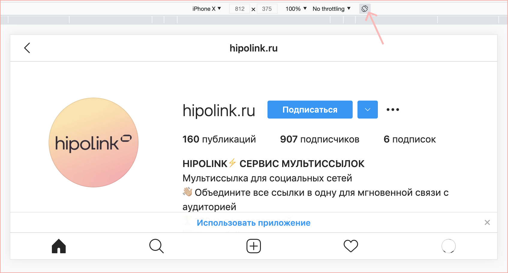 Возможно, Инстаграм попросит повернуть устройство вертикально. Выберите любую модель телефона в меню сверху. Справа увидите иконку телефона со стрелками. При нажатии экран поворачивается горизонтально/вертикально.