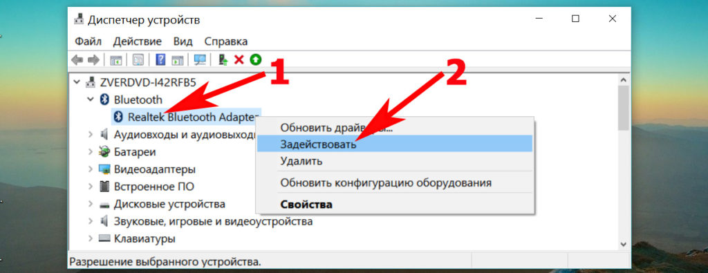 - Адаптер блютуз который вы нашли можно включить прямо здесь. Наведите курсор на него и нажмите правой клавишей мышки, выбираете «Задействовать». Если нужно отключить, тогда воспользуйтесь таким же способом как включали, только нажмите «Отключить».