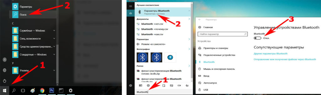 - Заходим «Пуск», клацаем «Поиск» и вбиваем слово «Bluetooth».