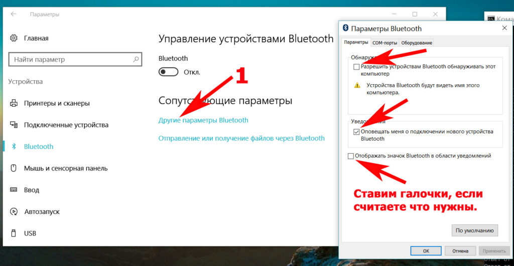 В том же окне, только ниже в разделе «Сопутствующие параметры» входим «Другие параметры Bluetooth». Здесь можно поставить галочки на ваше усмотрение.