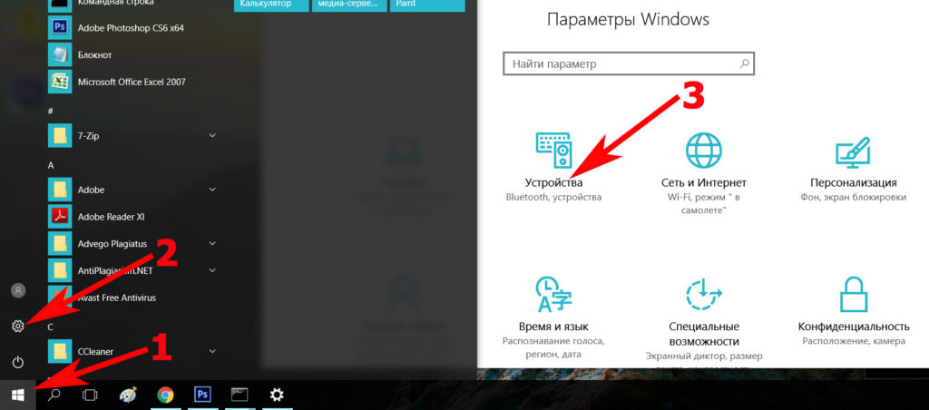 Входим в «Пуск», «Параметры», «Устройства».