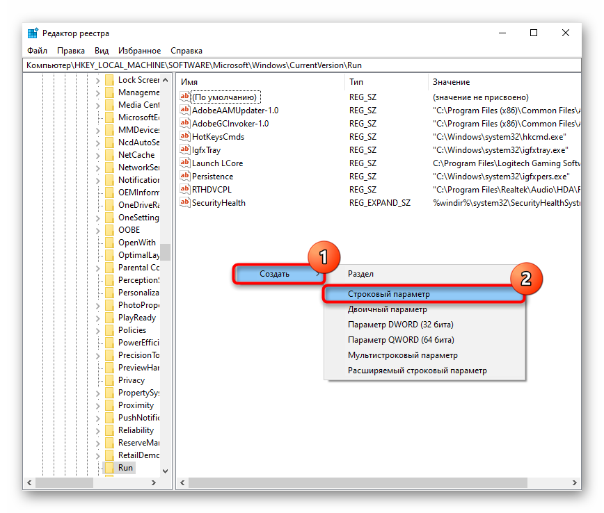В центральной части окна нажмите правой кнопкой мыши по пустому месту и из контекстного меню выберите «Создать» > «Строковый параметр».