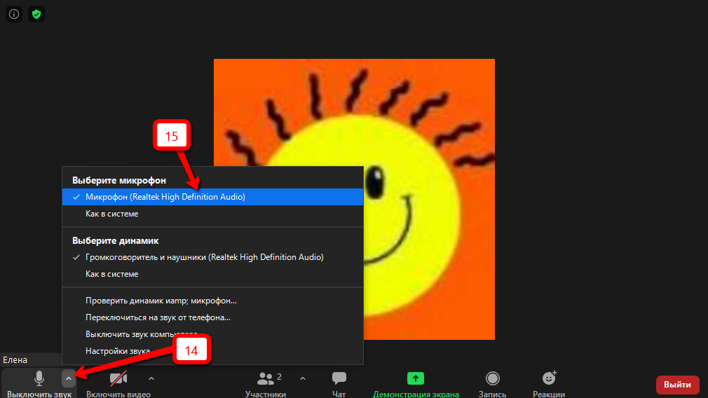 Если вы не используете микрофон, то можно просто слушать. Но у кого-то может возникнуть вопрос, как в Зуме отключить микрофон? Давайте разберёмся с этим. Для управления настройками звука на ПК в конференции нужно нажать на стрелку правее кнопки «Звук» (14) и во всплывающем меню выбрать пункт «Микрофон» (15). В скобках по умолчанию будет указан микрофон звуковой платы.