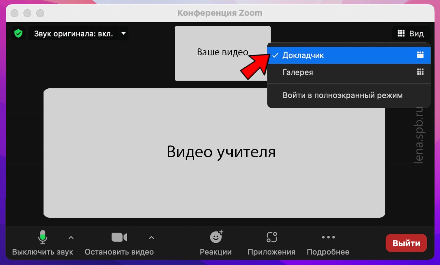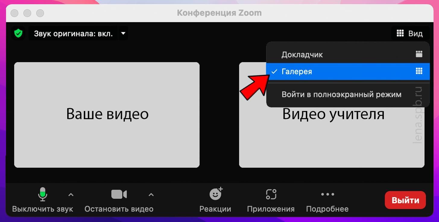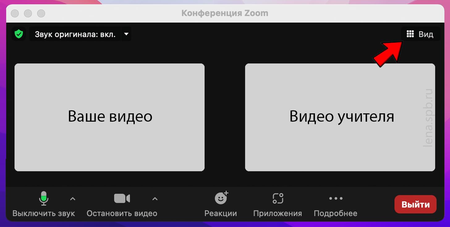 После того как звук и видео подключено, вы слышите преподавателя, а он слышит вас, настройте отображение экрана Zoom, чтобы ребёнку было удобно видеть себя и преподавателя на экране. Для выбора способа отображения используйте иконку «Вид» в верхнем правом углу экрана.