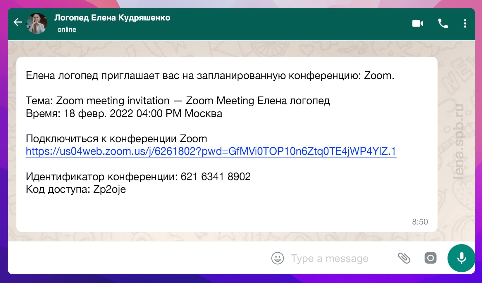 Я использую одноразовые ссылки и высылаю их утром в день занятия. Приглашение на занятие выглядит следующим образом (ссылка обычно подчеркнута и выделена синим цветом):